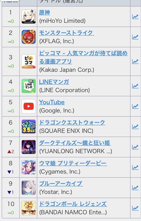 最新ソシャゲセルラン 原神1位、ウマ娘8位、ブルアカ9位、FGO43位